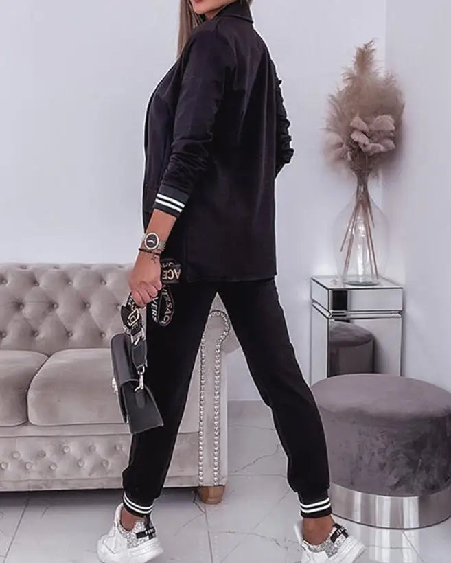 Kombinationen af en patchwork­stribet jakke og behagelige bukser skaber et perfekt outfit, der forener moderne design med maksimal komfort.