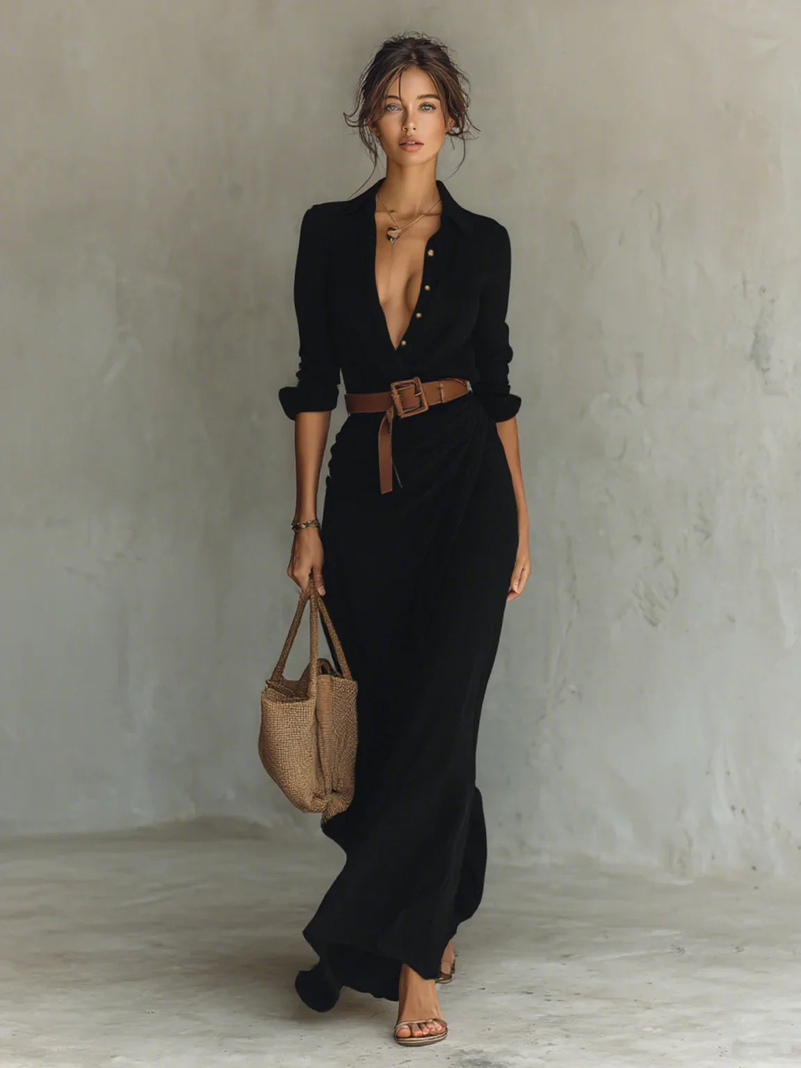 En elegant maxi-kjole med klassisk reverskrave, lange ærmer og enkeltradet lukning. Bæltet i taljen fremhæver din silhuet og giver et raffineret og feminint look.